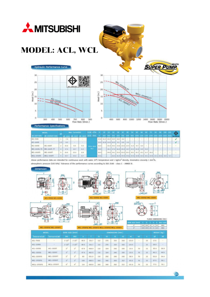 ACL, WCL MITSUBISHI รุ่น ACL, WCL ปั๊มนํ้าเหมาะสำหรับงานส่งนํ้าในบ้านพักอาศัยหรืออาคารทั่วไป ข้อมูลทางเทคนิค มอเตอร์ขนาด 1-5 HP ขนาดท่อ 2.5×4 นิ้ว ปริมาณนํ้า ลิตร ต่อ นาที แรงดันส่งสูง 16-42 เมตร แรงดันไฟฟ้า 220, 380 โวลต์ ACL, WCLDownload